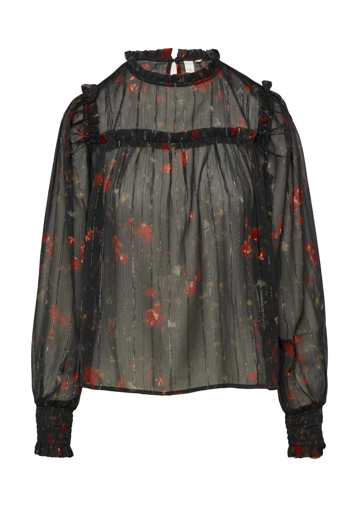 Blouse type: Blouseshirt; Design: Gevoerde zoom/rand, Keyholesluiting, Staande kraag; Type sluiting: Knoopsluiting; Materiaal: Chiffon; Motief: Bloemenprint; Kraag: Opstaande kraag; Details: Cut-outs, Ruches, Gedrapeerd; Extra's: Glitterend, Gladde stof, Lichte stof; Pasvorm: Normale pasvorm; Armlengte: Lange mouw; Lengte: Normale lengte