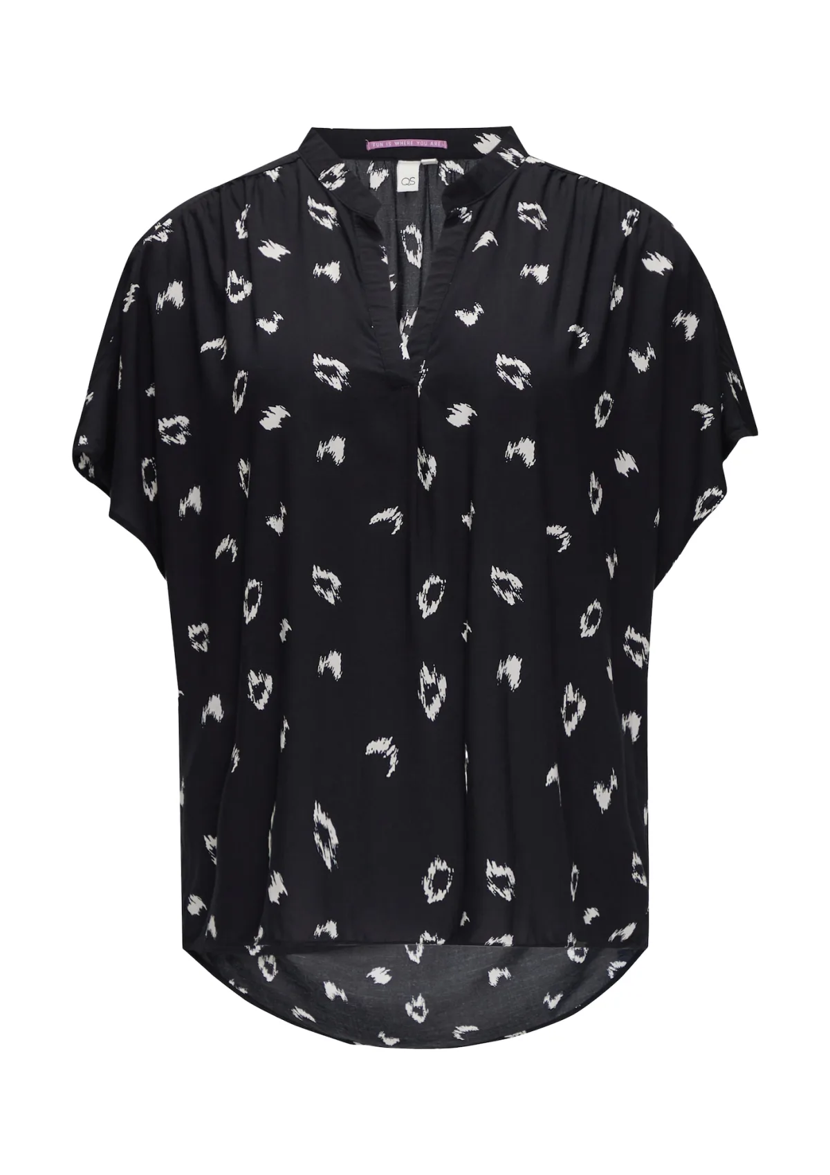 Blouse type: Blouseshirt; Design: Gevoerde zoom/rand; Materiaal: Viscose; Motief: Dierenprint; Kraag: Tuniek kraag; Details: Gedrapeerd; Extra’s: Lichte stof; Pasvorm: Losse pasvorm; Armlengte: Kwartmouw; Lengte: Normale lengte