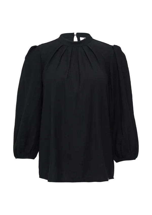 Blouse type: Blouseshirt; Design: Keyholesluiting, Pofmouwen; Type sluiting: Knoopsluiting; Materiaal: Viscose; Motief: Effen; Kraag: Opstaande kraag; Details: Cut-outs, Plooien, Gedrapeerd; Extra’s: Gladde stof, Crinkle look; Pasvorm: Normale pasvorm; Armlengte: Driekwart mouw; Lengte: Normale lengte