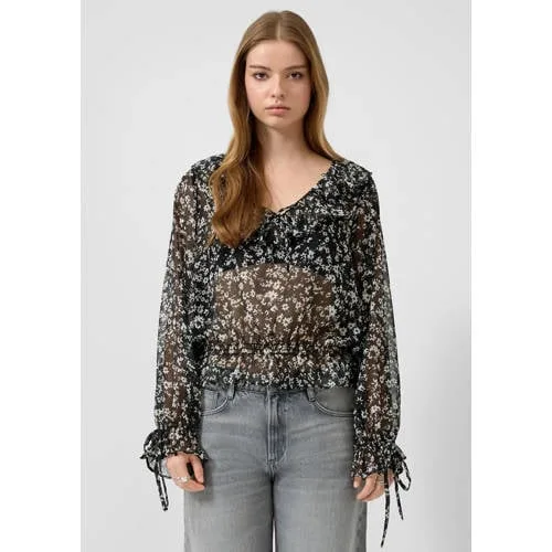 Zoek je een lichte top die je makkelijk aantrekt op drukke dagen, dan is deze luchtige bloemen top voor dames een praktische keuze. De zwart/ecru bloemenprint geeft direct een speelse uitstraling en de soepele chiffon stof valt losjes om je lichaam. De top heeft een comfortabele loose fit, waardoor je genoeg bewegingsvrijheid hebt en hij niet strak rondom je middel zit.Verfijnde details in chiffon Luchtige chiffon stof die soepel om je lichaam valt V-hals met kraag met ruches en sierveter voor een vrouwelijke uitstraling Gesmokte details en fijne plooitjes voor extra structuur Elastische boorden aan de lange mouwen voor een pofmouw Elastische zoom waardoor de top subtiel bloezend valt All-over bloemenprint in zwart/ecru die makkelijk te combineren is Loose fit pasvorm voor casual draagcomfortMakkelijk te stylen voor elke dagDeze top past goed bij jouw dagelijkse garderobe. Draag hem casual op een jeans met sneakers of combineer met een zwarte broek voor een meer geklede look. De luchtige stof maakt de top ideaal voor het voorjaar en voor laagjes onder een vest of licht jasje.QS: moderne stijl voor elke dagQS ontwerpt kleding die past bij het dagelijkse leven, met een focus op draagbare trends en fijne details. De collecties combineren een moderne uitstraling met praktische ontwerpen, zodat je gemakkelijk outfits samenstelt die goed voelen en er verzorgd uitzien.Een top die je garderobe meer kleur en beweging geeft.