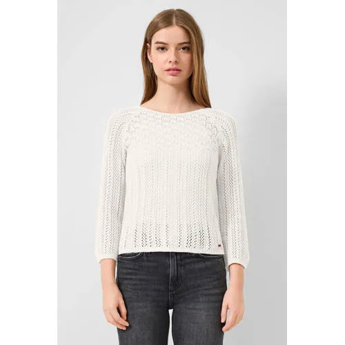 Deze QS katoenen trui is een lichte, fijngebreide basic met een vrouwelijke uitstraling. De subtiele ajourstructuur en gehaakte details geven een luchtig effect, terwijl de slim fit pasvorm mooi aansluit op het lichaam. De ronde hals en driekwart raglanmouwen zorgen voor een ontspannen, maar verzorgde look die je zowel casual als wat netter kunt dragen.Verfijnde details voor elke dag Gemaakt van 100% katoen, dat zacht aanvoelt op de huid Ajourmotief en gehaakte details voor een luchtige en verfijnde uitstraling Slim fit pasvorm die het silhouet volgt zonder strak te zitten Ronde hals die makkelijk combineert met verschillende sieraden Driekwart raglanmouwen voor extra bewegingsvrijheid bij de schouders Rechte mouwen met geribde zoom, zodat de trui mooi in model blijft Effen kleur, eenvoudig te combineren met jeans, rok of pantalon Zonder zakken voor een rustige, clean voorzijdeLicht en luchtig in je dagelijkse outfitsDeze trui is ideaal voor tussenseizoenen of dagen waarop je graag laagjes draagt. Het opengewerkte ajourpatroon maakt de trui licht en luchtig, waardoor een top eronder mooi subtiel doorschemert. Combineer met een hoge jeans voor een ontspannen look, of met een nette broek voor een rustige, verzorgde outfit.QS: modern en toegankelijkQS staat voor moderne, draagbare mode met een toegankelijke uitstraling. De ontwerpen zijn afgestemd op dagelijks gebruik en sluiten aan bij een actieve levensstijl. Met deze trui kies je voor een betrouwbaar kledingstuk dat gemakkelijk in je bestaande garderobe past.Een lichte knit die je zo uit de kast pakt voor een verzorgde look, dag na dag.