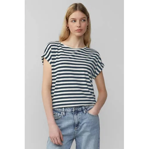 Dit zachte QS T-shirt is een basic met een moderne streepprint. De streepprint geeft direct een heldere uitstraling en de soepele jersey van lyocellmix valt luchtig om het lichaam. Door de losse pasvorm en de elastische kwaliteit voelt dit shirt de hele dag prettig aan.Luchtige top met speelse details Gemaakt van een lyocellmix jersey, zacht en soepel op de huid Losse fit voor een relaxed silhouet dat niet tekent Ronde hals die goed aansluit bij verschillende halslijnen Korte vleermuismouwen met vaste omslag voor een casual effect Streepprint, gemakkelijk te combineren met diverse onderstukken Geen zakken voor een rustige, strakke voorkantMakkelijk te combineren in elke outfitDeze top past goed bij een jeans, linnen broek of korte broek. Door de loose fit kan het T-shirt zowel los gedragen worden als deels in de taille gestopt. De korte mouwen met omslag maken de top geschikt voor zowel vrije tijd als een werkdag of etentje.QS: eigentijdse casual stijlQS staat voor toegankelijke mode met een actuele uitstraling. De collectie richt zich op comfortabele basics met subtiele details. Met dit T-shirt kies je voor een item dat eenvoudig in te passen is in een moderne, dagelijkse garderobe.Een praktische basis voor dagen waarop je gemak en stijl graag combineert.