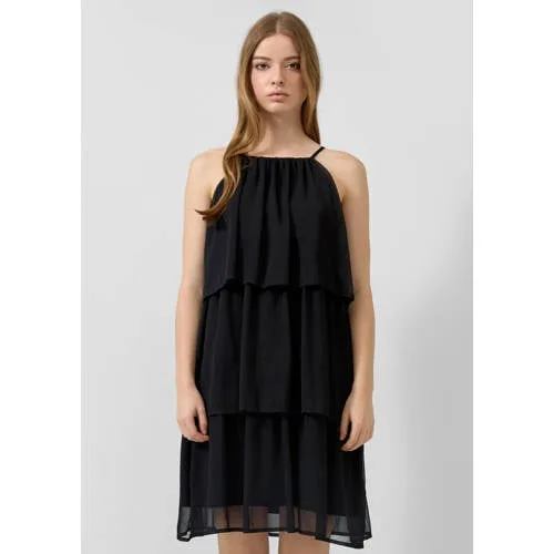 Deze zwarte korte chiffon jurk met spaghettibandjes is een luchtige keuze voor zonnige dagen, festivals en feestjes. De jurk valt kort en heeft een regular fit, waardoor de stof soepel langs het lichaam valt zonder strak te zitten. De vierkante halslijn en fijne bandjes geven een open, elegante bovenkant, terwijl de gekreukte stof en volant details zorgen voor een levendig effect.Lichte stof met speelse details Luchtige chiffonstof met semi-transparante look voor een lichte, gelaagde uitstraling Jersey voering die zacht aanvoelt op de huid en doorschijnen voorkomt Regular fit pasvorm die prettig valt bij het korte model Vierkante hals en spaghettibandjes voor een open decolleté Volant detail onderaan voor extra bewegingsvrijheid en een zwierig effect Striksluiting achter, handig om de bovenkant net wat beter aan te laten sluiten Effen zwarte kleur, goed te combineren met hakken, sandalen of laarsjes Geen zakken voor een glad lijnenspel rondom de heupenGeschikt voor verschillende gelegenhedenDeze jurk past goed bij een festival, een party of een etentje. Met sandalen en een spijkerjasje ontstaat een meer casual look, met hakken en sieraden krijgt de outfit een aangeklede uitstraling. De luchtige, soepel vallende stof maakt de jurk passend voor het voorjaar en zomerse avonden.Mode van QSQS staat voor eigentijdse mode met een toegankelijke stijl. De collecties zijn afgestemd op het dagelijks leven en zijn ontworpen om aan te sluiten op actuele trends. Deze jurk van QS biedt een praktische basis voor uiteenlopende momenten, van een etentje tot een feestje.Een lichte jurk die je gemakkelijk aantrekt op zonnige dagen en avondjes uit.