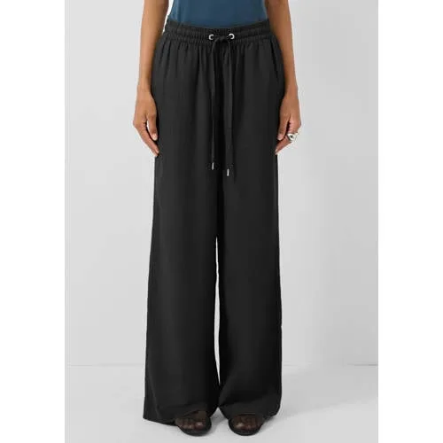 Ga voor luchtig gemak met deze zwarte linnenmix broek met wide leg voor dames. De soepele stof valt losjes om je benen en voelt prettig aan op warme dagen. De combinatie van 72% viscose en 28% linnen geeft een zachte touch met de typische, frisse uitstraling van linnen. Ideaal voor een ontspannen dag in de stad of op vakantie.Comfortabele pasvorm met luchtige wide leg Wide leg pijpen voor een losse, zwevende look en extra bewegingsvrijheid Elastische tailleband met koord voor een comfortabele, aanpasbare taille Mid rise bandhoogte die mooi rond je heupen valt Ademend en soepel materiaal, perfect voor zomerse dagen Steekzakken aan de voorkant voor praktische opbergruimte Effen zwarte kleur, makkelijk te combineren met tops en sandalen Regular lengte die mooi aansluit bij sneakers, slippers of hakkenRelaxed voor elke casual dagDeze broek past bij dagelijkse momenten, van een casual werkdag tot een avondwandeling op vakantie. Combineer met een eenvoudige T-shirt, cropped top of luchtige blouse en je hebt in één keer een ontspannen, maar verzorgde outfit. De elastische tailleband maakt de broek ook fijn om de hele dag te dragen.QS: eigentijdse stijl voor elke dagQS richt zich op moderne, alledaagse mode met een casual karakter. Kledingstukken zijn ontworpen om makkelijk te combineren te zijn, zodat je met weinig moeite een complete look samenstelt. Met deze broek kies je voor een stijl die eenvoudig, comfortabel en actueel is.Een lichte, ademende basic waar je de hele zomer plezier van hebt.