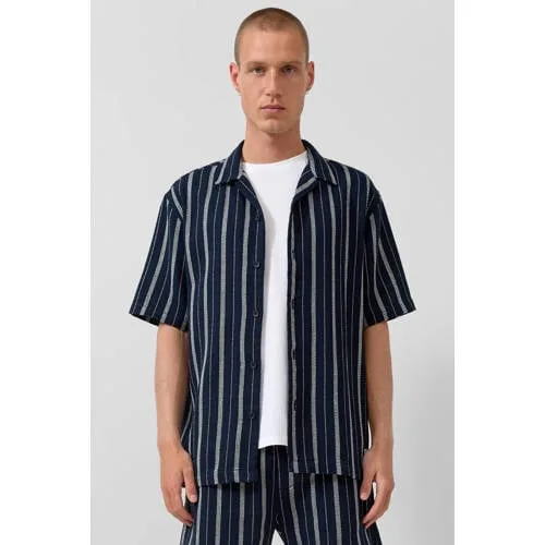 Dit donkerblauwe gestreept casual heren overhemd met korte mouw van QS heeft een relaxte uitstraling en draagt luchtig op warme dagen. De resort_fit valt wat losser rond het lichaam en de zachte geweven stof van 100% katoen voelt prettig aan op de huid. De subtiele streep en de reverskraag geven het overhemd een moderne, zomerse look die makkelijk te combineren is met je favoriete basics.Ontworpen voor ontspannen dagen Gemaakt van 100% katoen voor een soepele en ademende stof Reverskraag en korte mouwen voor een luchtige, resortachtige uitstraling Donkerblauwe basis met streepmotief voor een tijdloze, casual look Relaxed pasvorm (resort_fit) voor extra bewegingsvrijheid Knoopsluiting aan de voorkant, makkelijk aan en uit te trekken Zijsplitten voor een mooie val over je broek of short Geen borstzak voor een rustige en strakke voorkantCasual styling in de praktijkDraag dit overhemd open over een wit T-shirt met een jeans of chino voor een ontspannen weekendoutfit. Ook dichtgeknoopt boven een korte broek komt het goed tot zijn recht. De donkerblauwe kleur maakt het eenvoudig om te combineren met neutrale tinten zoals wit, beige en grijs.QS als betrouwbare basis in je kledingkastQS richt zich op moderne kleding die past bij alledaagse momenten. De ontwerpen hebben een toegankelijke stijl en worden gemaakt met aandacht voor pasvorm en draagcomfort. Zo vormt dit overhemd een praktische en stijlvolle toevoeging aan je garderobe, waar je vaak naar zult grijpen.Een comfortabele keuze voor dagen waarop je er verzorgd uit wilt zien zonder moeite.