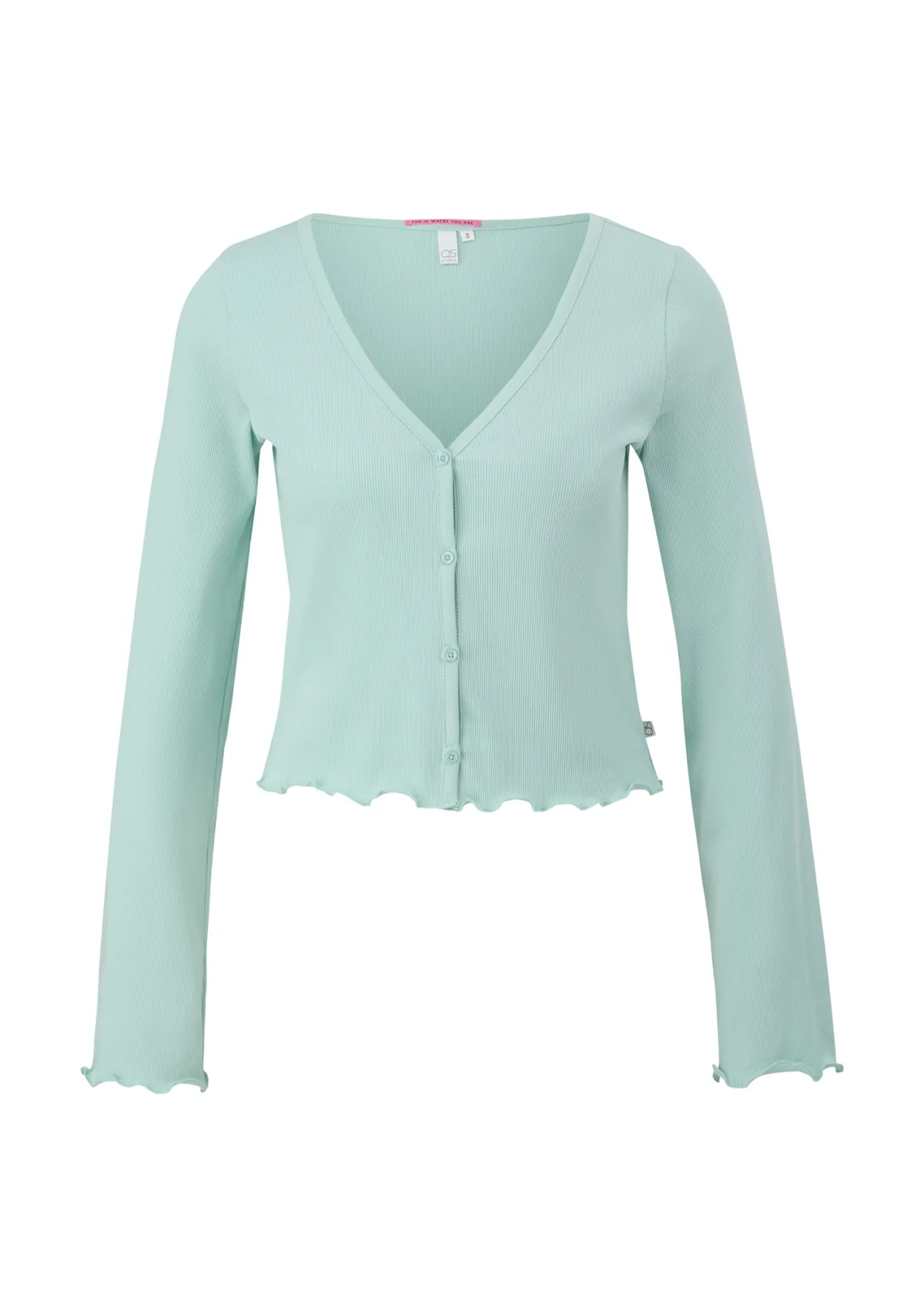 Type sluiting: Knoopsluiting; Materiaal: Jersey; Halstype: V-hals; Details: Ruches; Pasvorm: Slanke pasvorm; Armlengte: Lange mouw; Lengte: Korte pasvorm