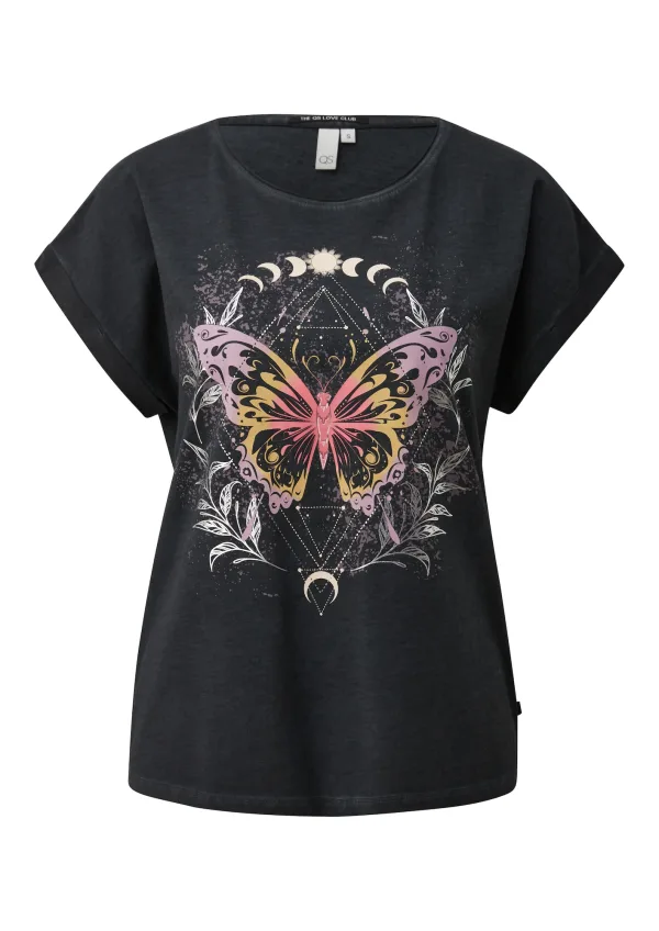 Ga voor een relaxte en tegelijk opvallende look met dit QS T-shirt met dierenprint. De speelse print op de voorkant valt direct op, terwijl de loose fit en het zachte jersey van 100% katoen zorgen voor een comfortabel gevoel. Ideaal voor een casual dag, maar ook makkelijk te combineren in een stoerdere outfit.Details die het verschil maken Gemaakt van 100% katoen in soepele jersey, ligt zacht op de huid Loose fit met vleermuismouwen voor een ontspannen silhouet Korte mouwen met vaste omslag voor een verzorgde afwerking Ronde hals, makkelijk te combineren met verschillende stijlen Langer achterpand en afgeronde zoom voor een afgerond silhouet Garment dye finish voor een iets gewassen, casual uitstraling Print op de voorkant met dierenprint als blikvanger Zonder zakken, voor een egale voorkantCasual styling voor elke dagDit QS T-shirt is een praktische basis voor dagelijks gebruik. Combineer het met een jeans of shorts voor een ontspannen look of draag het in een rok om de loose fit en afgeronde zoom goed uit te laten komen. Het langere achterpand zorgt dat het T-shirt goed blijft zitten, ook bij een legging.QS, mode met een eigentijdse twistQS staat voor toegankelijke mode met een moderne uitstraling. De collecties zijn ontworpen met aandacht voor draagbaarheid en actuele trends. Daardoor passen de items makkelijk in een bestaande garderobe en zijn ze geschikt voor dagelijks gebruik.Een T-shirt met dierenprint dat comfort, een opvallende print en een ontspannen pasvorm combineert.