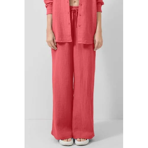 Deze koraalrode mousseline broek voor dames is een lichte en luchtige basis voor zomerse dagen. De double face weefstof van 100% katoen met subtiele crinkle structuur voelt zacht aan op de huid en beweegt soepel met je mee. De mid rise taille en wide leg pijpen geven een ontspannen silhouet dat comfortabel zit tijdens een dag in de stad of op vakantie.Luchtig comfort voor elke dag Gemaakt van 100% katoen, zacht en ademend voor warme dagen Elastische tailleband met koordsluiting voor een flexibele pasvorm Wide leg pijpen en rechte pasvorm voor veel bewegingsvrijheid Lange lengte en regular beenlengte, ideaal voor casual looks Effen koraalrode kleur die eenvoudig te combineren is Steekzakken voor, sierzakken en zakken achter voor een ontspannen uitstraling Luchtige mousseline met crinkle effect, sluit goed aan bij een zomerse garderobeCasual en vakantieproofDeze broek sluit aan bij een dagelijkse, casual stijl en blijft ook op vakantie licht en luchtig aanvoelen. Combineer met een eenvoudig T-shirt of een top in ton-sur-ton kleuren voor een rustige look. De ademende stof en elastische tailleband maken dit een broek waar je gemakkelijk de hele dag in rondloopt, van terras tot strandwandeling.QS: moderne stijl voor elke dagQS ontwerpt kleding die past bij het dagelijks leven, met aandacht voor comfort en actuele trends. De collecties zijn gericht op draagbare items die je eenvoudig combineert met wat je al in de kast hebt. Zo voeg je met deze mousseline broek op een toegankelijke manier kleur en gemak toe aan je zomerse outfits.Een luchtige, zachte keuze voor dagen waarop je ontspannen maar verzorgd voor de dag wilt komen.