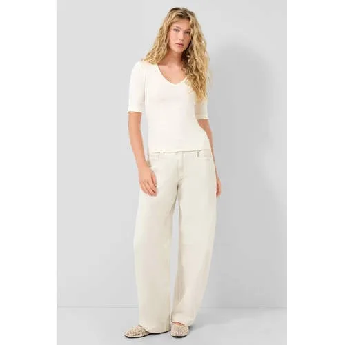 Dit QS T-shirt met V-hals is een veelzijdige basic voor elke dag. De ecru kleur oogt zacht en rustig en laat zich makkelijk combineren met je favoriete jeans, rok of pantalon. Door de ribstof sluit het T-shirt mooi aan op je lichaam, terwijl het materiaal soepel meebeweegt. De slim fit pasvorm en de V-hals zorgen samen voor een vrouwelijke en moderne look.Details die je elke dag draagt Gemaakt van 100% katoen, voelt zacht aan op de huid Ribstof met fijne structuur voor een aansluitend maar comfortabel gevoel V-hals die de halslijn subtiel accentueert Korte mouwen met vaste omslag voor een nette afwerking Effen ecru kleur, makkelijk te combineren in verschillende outfits Slim fit pasvorm die het silhouet volgt zonder te strak te zittenVoor je dagelijkse garderobeDit T-shirt komt uit de daily collectie en past goed bij dagen waarop je een eenvoudige, maar verzorgde outfit wilt. Onder een blazer naar je werk, op een korte broek in het weekend of met een rechte jeans en sneakers, het T-shirt vormt een rustige basis waar je op kunt bouwen.QS, moderne stijl voor elke dagQS richt zich op kleding die past bij een actieve en moderne levensstijl. De items zijn ontworpen met aandacht voor pasvorm en draagcomfort, zodat je ze vaak en lang kunt dragen. Met dit T-shirt voeg je een praktische basic toe aan je kast waar je gemakkelijk naar grijpt.Een rustige, comfortabele basislaag die moeiteloos in jouw dagelijkse outfits past.