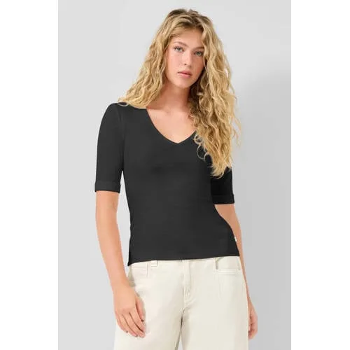 Voor een eenvoudige basis met een moderne twist is dit QS T-shirt met V-hals een praktische toevoeging aan je garderobe. Het shirt is gemaakt van 100% katoen in ribstof, waardoor het zacht aanvoelt en licht meebeweegt met je lichaam. De zwarte kleur maakt het een veelzijdig item dat je het hele jaar door kunt dragen.Dagelijkse basic met subtiele details Ribstof in 100% katoen voor een zachte touch en een subtiel structuureffect V-hals die de halslijn accentueert en goed te combineren is met sieraden Slim fit pasvorm die aansluit op het lichaam zonder strak gevoel Korte mouwen met vaste omslag voor een nette, casual look Effen zwart ontwerp dat goed te stylen is met jeans, rok of blazer Geschikt voor elke dag dankzij het praktische ontwerp uit de 'Daily' collectieZo draag je dit zwarte T-shirtDit T-shirt past gemakkelijk in je dagelijkse outfits. Combineer het met een high waist jeans en sneakers voor een ontspannen dag, of draag het in een nette broek met een blazer voor een meer zakelijke uitstraling. De slim fit maakt het ook geschikt om onder een vest of jasje te dragen zonder extra volume.QS, mode voor elke dagQS richt zich op draagbare mode met een eigentijdse uitstraling. De collecties zijn afgestemd op dagelijks gebruik, met comfortabele materialen en toegankelijke modellen die makkelijk te combineren zijn. Zo stel je zonder moeite outfits samen die passen bij een druk leven waarin werk, gezin en vrije tijd door elkaar lopen.Een praktische basic voor dagelijks gebruik.