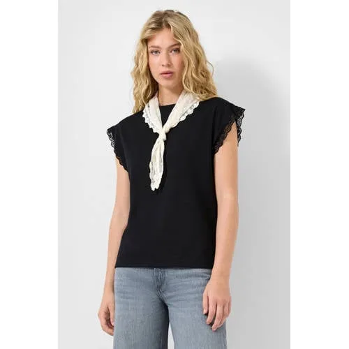 Deze zwarte QS T-shirt top voor dames is een praktische basic met een subtiel speels accent. De top is gemaakt van 100% katoen in een zachte jersey kwaliteit, waardoor het materiaal soepel valt en prettig aanvoelt op de huid. De ronde hals en korte vleermuismouwen zorgen voor een ontspannen uitstraling en extra bewegingsvrijheid. Dankzij de loose fit valt de top luchtig om het lichaam, ideaal voor dagelijks gebruik in het voorjaar en de zomer.Losse pasvorm met kantdetail Gemaakt van 100% katoen in zachte jersey stof Loose fit pasvorm voor een comfortabele, luchtige look Korte vleermuismouwen voor een moderne, losse schouderlijn Ronde hals die aansluit zonder strak te zitten Kantdetails zorgen voor een subtiel accent Effen zwarte kleur, eenvoudig te combineren met je garderobeEveryday top voor vele outfitsDeze top uit de 'daily' collectie is geschikt voor allerlei momenten op een dag. Draag de zwarte T-shirt top op een jeans voor een casual look of combineer met een rok en sandalen voor een wat nettere combinatie. De lichte stretch in de stof zorgt dat de top prettig meebeweegt, of je nu thuis bent, werkt of onderweg bent.QS, moderne stijl voor elke dagQS richt zich op kleding die past in een druk, dagelijks leven. Toegankelijke modellen, actuele details en vertrouwde materialen vormen de basis van de collectie. Met dit T-shirt kies je voor een draagbare top met een moderne pasvorm, die je eenvoudig terugpakt uit de kast.Een comfortabele, zwarte top die je het hele seizoen door gemakkelijk combineert.