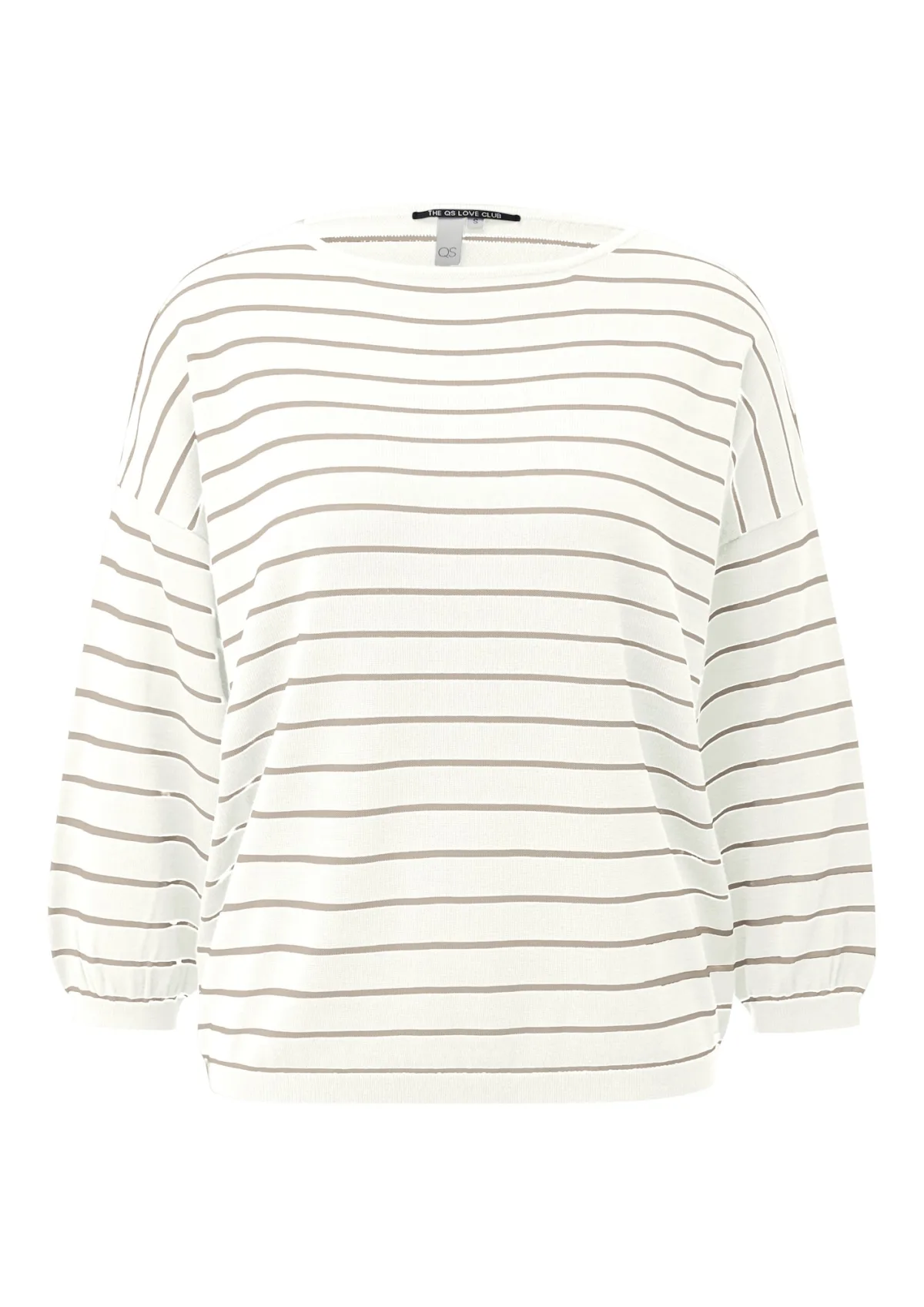 Design: Geribbelde kraag, Elastische taille/zoom, Pofmouwen, Overcut schouder; Materiaal: Knitwear; Halstype: Boothals; Motief: Gestreept; Details: Gedrapeerd; Extra's: All-over patroon, Op staal naden; Pasvorm: Losse pasvorm; Armlengte: Driekwart mouw; Lengte: Normale lengte