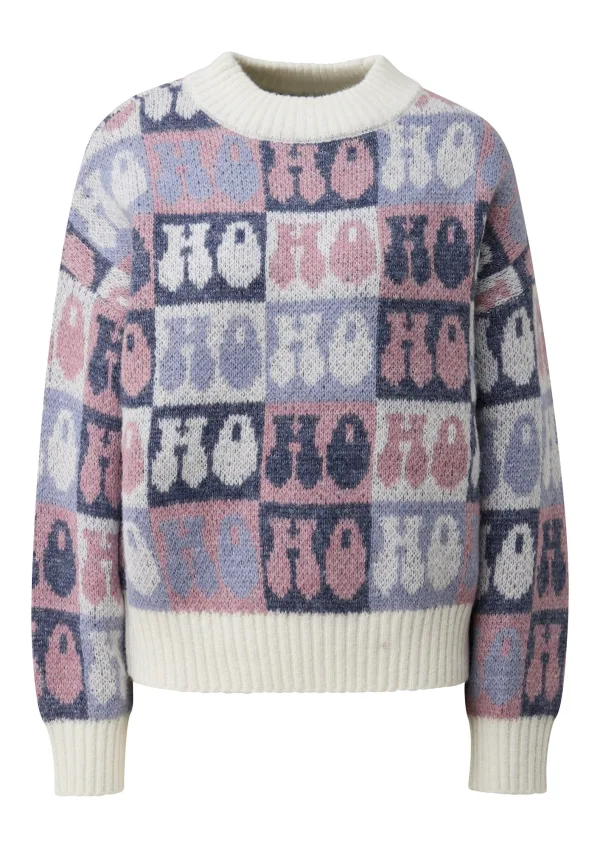 Design: Geribbelde kraag, Rechte zoom, Geribd ceintuurtje, Overcut schouder; Materiaal: Knitwear; Halstype: Ronde hals; Motief: Tekst print; Extra's: All-over patroon, Fully fashioned, Kerstdesign; Pasvorm: Losse pasvorm; Armlengte: Lange mouw; Lengte: Normale lengte