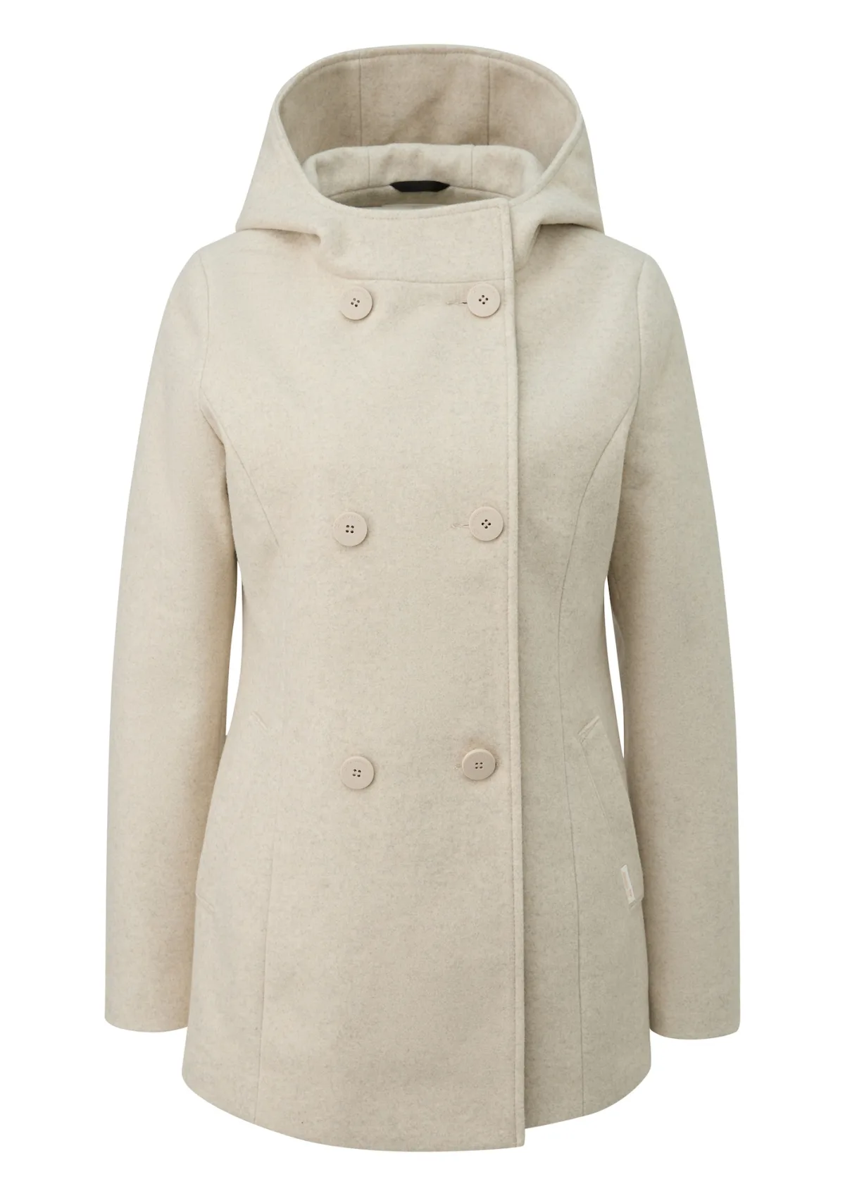 Type mantel: Klassieke mantel; Design: Knop placket, Met capuchon, Knop sluiting; Type sluiting: Knoopsluiting; Voering: Licht gevoerd; Motief: Mélange; Extra's: Op staal naden; Pasvorm: Normale pasvorm; Lengte: Korte pasvorm