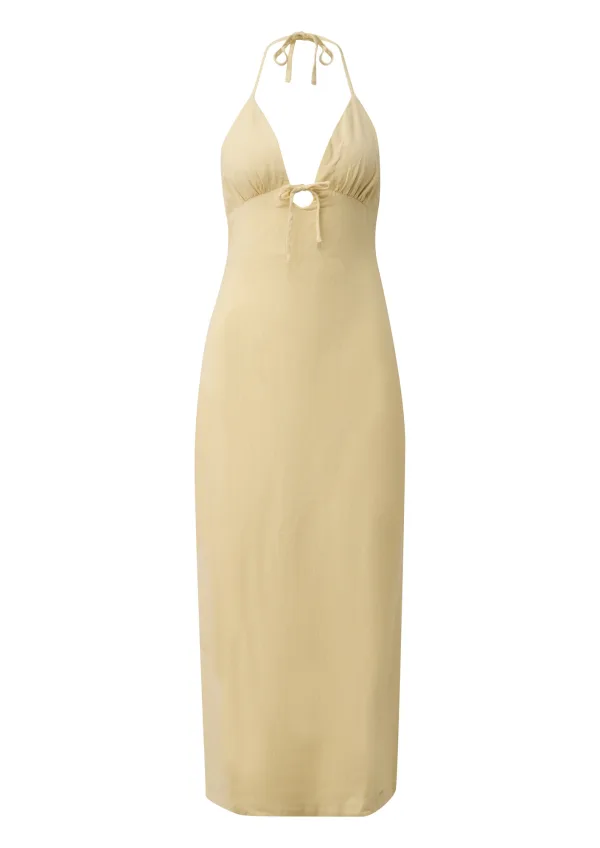 Design: Rug rits, Rug inkeep, Diepe snit/decolleté, Om te knopen/binden; Type sluiting: Ritssluiting; Materiaal: Linnen; Halstype: V-hals; Motief: Effen; Soort bandjes: Haltermodel; Details: Cut-outs, Gedrapeerd, Backless; Extra's: Op staal naden, Voelt zacht aan; Lengte: 7/8 lengte; Snit: Getailleerd; Pasvorm: Slanke pasvorm; Armlengte: Mouwloos