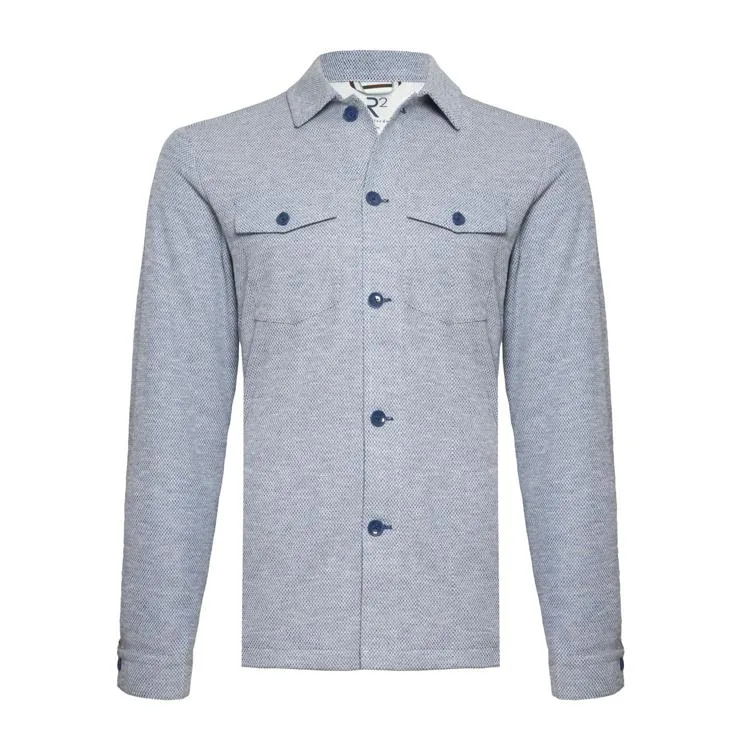 Dit overshirt is gemaakt in een zachte, middelzware geweven kwaliteit met subtiele blauwgrijze, gemêleerde structuur. Het heeft een klassieke kraag, een volledige knoopsluiting met contrasterende blauwe knopen en twee borstzakken met klep & knoop. Binnenin staat het R2 logo op het label. De rechte zoom en lange mouwen geven comfort en nette lijnen. Een doordacht heren overhemd van R2 Amsterdam dat je vaak pakt.