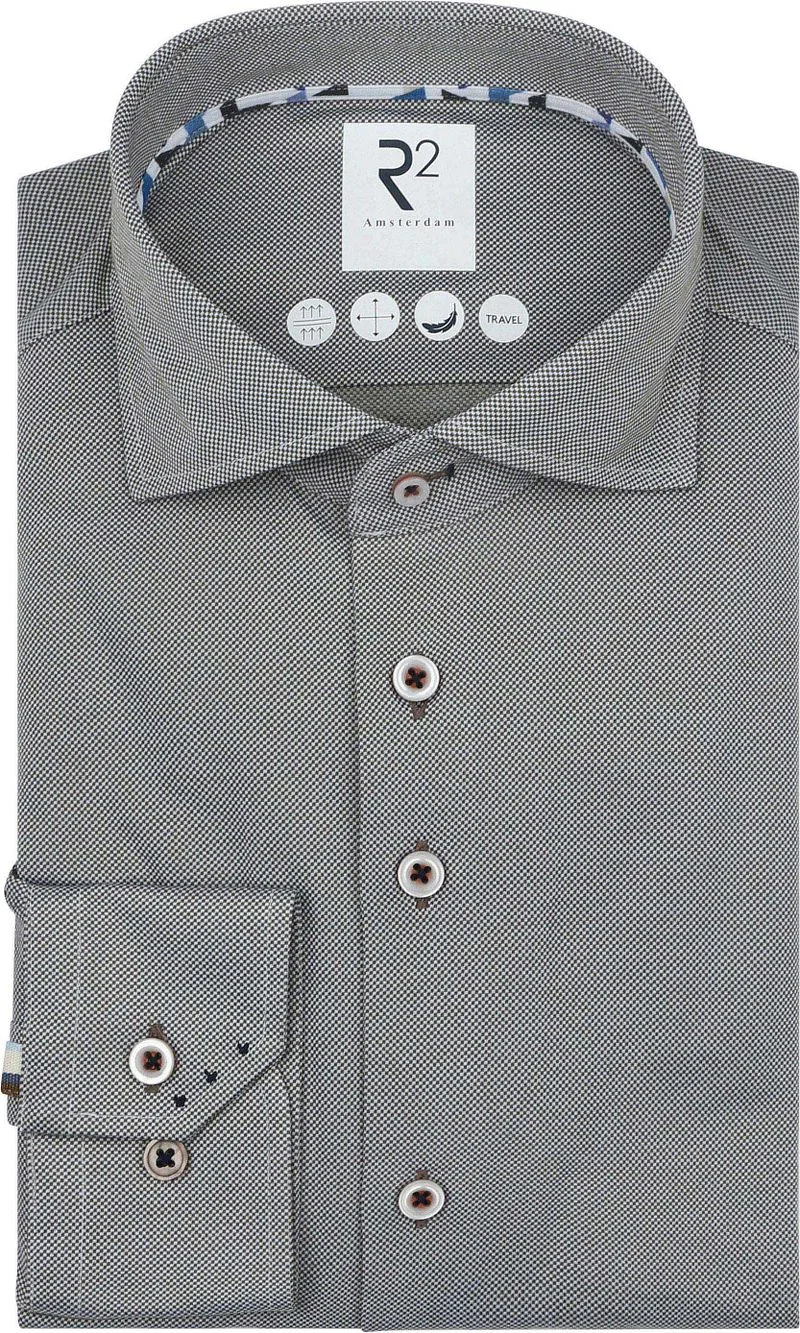 Op zoek naar hoge kwaliteit Heren Overhemden om je kledingkast mee op te vullen? Met deze Overhemd van R2 Amsterdam heb je altijd een goed Overhemd in huis. De R2 Overhemd Technical Knitted Dobby Groen is heel geschikt!R2 Overhemd Technical Knitted Dobby Groen in de kleur Beige met een pasvorm Modern-fit is gemaakt van Katoen en Polyester met Enkel manchet met een Effen dessin en Lange mouw