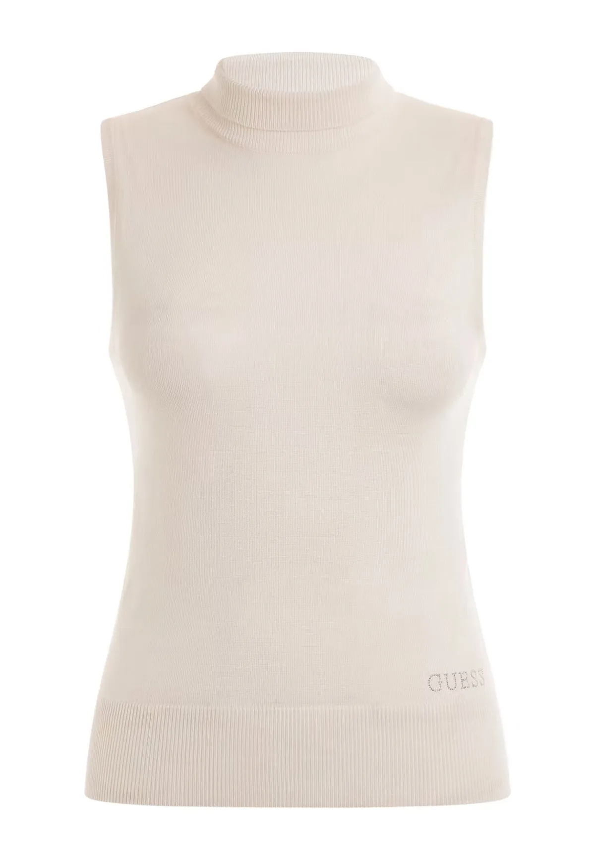 Eenvkleurige gebreide top met opstaande kraag, ribgebreide mouwen en decoratieve steentjesapplicatie in een figuuraccentuerende pasvorm.