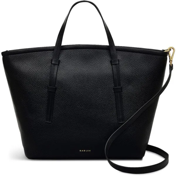 Zwarte Radley Bridgewater damestas, gemaakt van leer. Voorzien van: ritssluiting aan de bovenkant, gouden details, verstelbare schouderband, hanglabel en hoogte 26 cm x breedte 35 cm x diepte 10 cm.