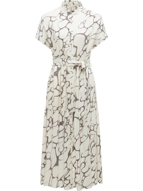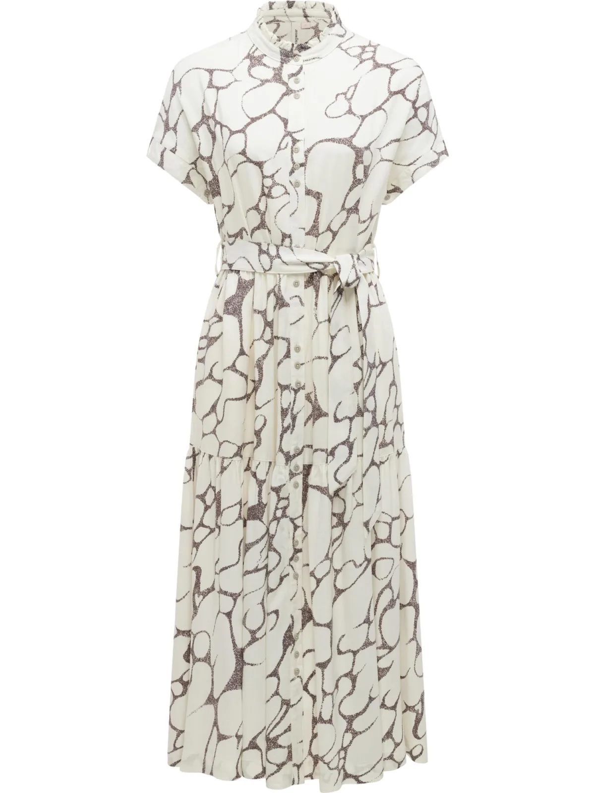 Design: Tailleband; Type sluiting: Knoopsluiting; Materiaal: Viscose; Halstype: Opstaande kraag; Kraag: Opstaande kraag; Details: Volant, Gedrapeerd; Extra's: All-over patroon; Lengte: 7/8 lengte; Pasvorm: Normale pasvorm; Armlengte: Kwartmouw