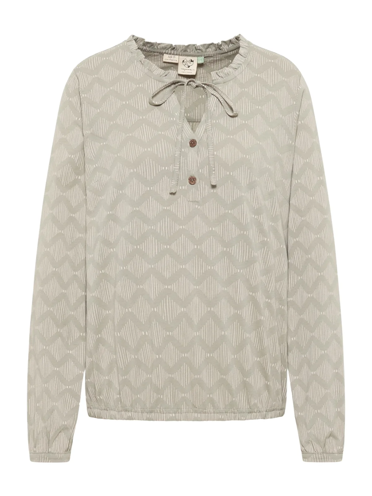 De 'ONELIA ORG PRINT' top met lange mouwen maakt indruk met zijn snit en grafische patroon. Het zachte materiaal en de losse snit maken deze top ideaal voor elke gelegenheid. De wijde mouwen met smalle manchetten bij de pols geven de look een ontspannen touch. Een lichte rimpeling onder het juk op de rug zorgt voor een interessante look. De V-hals met knoopsluiting wordt benadrukt door een koordje en ruches bij de halslijn. Supermodieus en veelzijdig, perfect voor dagelijks gebruik of voor speciale gelegenheden.