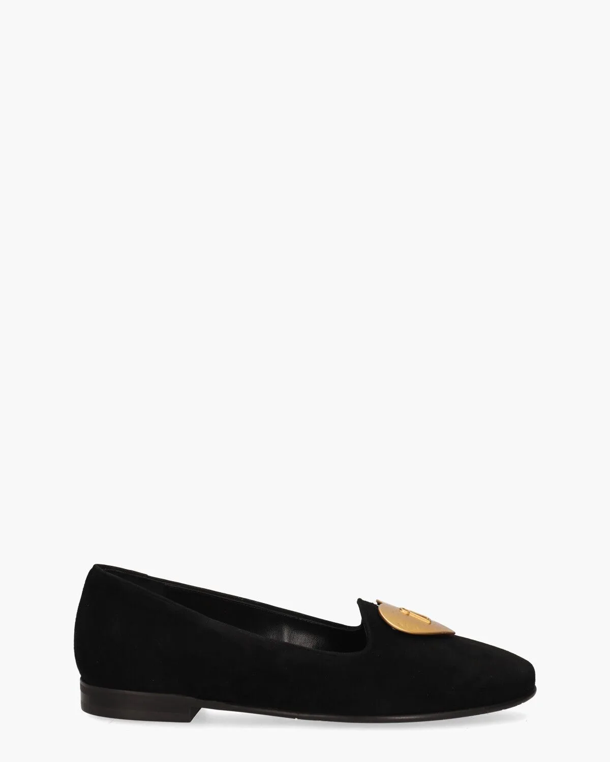 Loafers voor dames 6894 uit de collectie van het merk RAS. Dit model heeft een zacht zwart suède bovenwerk. De binnenzijde is in leer met een vast voetbed uitgevoerd. Het goudkleurige hartslotje en de bijpassende gouden sleutel op de neusjes geven de instappers een bijzondere look. De hak is 2 cm hoog en de onderzool is van rubber gemaakt.