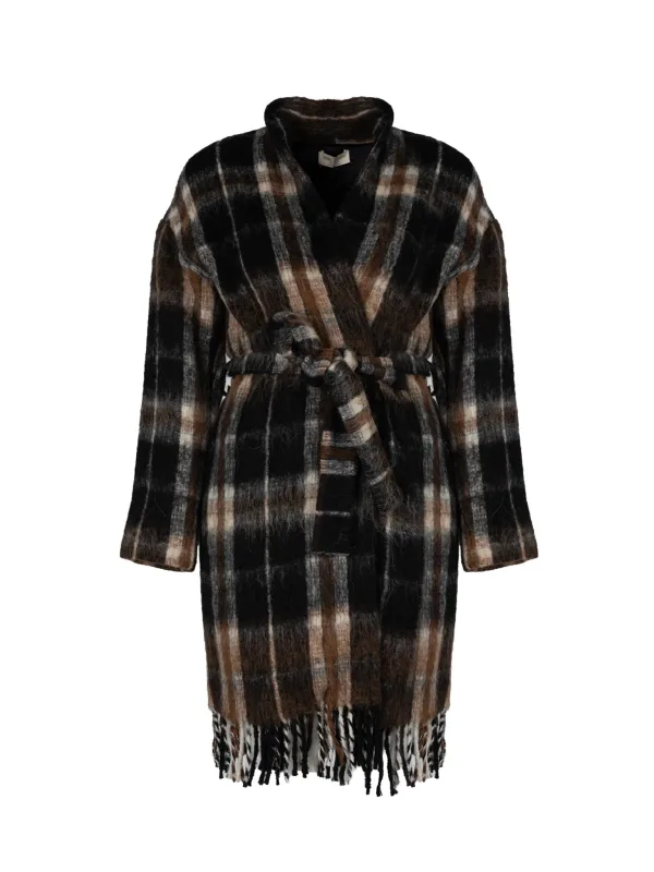 Aansluitende snit - Perfect accentuerend silhouet voor een elegante en slanke look die geschikt is voor zowel alledaagse kleding als speciale gelegenheden. V-halslijn - De klassieke V-halslijn voegt subtiele charme toe door de nadruk te leggen op de nek en sleutelbeenderen, en geeft de algehele look lichtheid en vrouwelijke gratie. Gestrikt in de taille - Een verstelbare riem in de taille zorgt voor een pasvorm op maat, benadrukt natuurlijke vormen en biedt de hele dag comfort. Onderkant afgewerkt met franjes - Stijlvolle franjes aan de onderkant voegen dynamiek en originaliteit toe en creëren een opvallend accent dat de visuele aantrekkingskracht vergroot en de jurk een uniek karakter geeft. Merkdetail in de nek - Een discreet, merkspecifiek detail in de nek voegt prestige toe en getuigt van de hoge kwaliteit van het product en benadrukt de exclusiviteit. Gemaakt van hoogwaardige stof met toegevoegde wol - Het materiaal met wol zorgt niet alleen voor een elegante look, maar ook voor warmte en comfort, perfect voor koelere dagen, en garandeert de levensduur en duurzaamheid van het product.