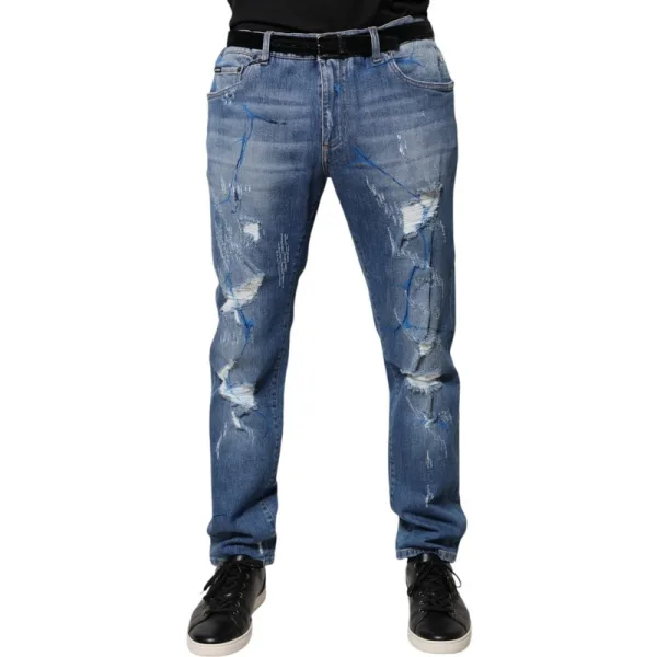 Stap naar buiten, val op en bezit het moment in deze distressed denim jeans. Beleef ongeëvenaard stijl en comfort, waardoor elke casual gelegenheid een statement wordt. Het klassieke vijf-pocket ontwerp biedt praktische voordelen met een stijlvolle snit, terwijl de unieke scheuren en blauwe verfspetters ervoor zorgen dat je de aandacht trekt. Geniet van de duurzame, onderhoudsarme denim die meegaat met jouw levensstijl. Deze jeans integreren moeiteloos in elke garderobe en bieden een mix van robuustheid en haute couture. Kleed ze casual of formeel; jouw stijl, jouw regels.