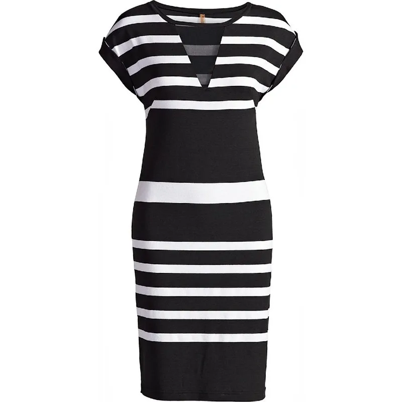 Jurk CONQUISTA in bedrukte, zwart en wit gestreepte stof: viscose-elastaan. Zwarte bies in dezelfde stof aan de hals en de manchetten. Mouwloos met doorschijnende zwarte tulestof in een V-vorm bij de halslijn. Recht model.