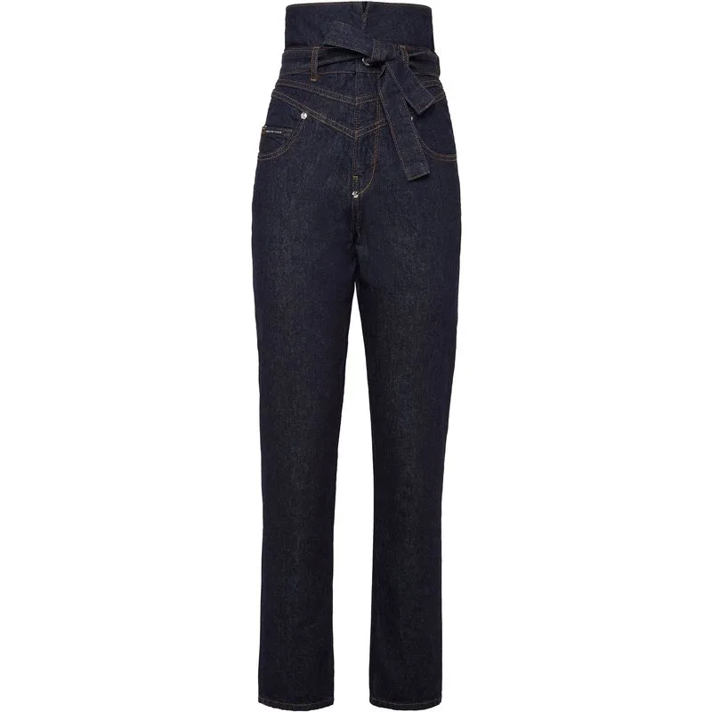 Stretch stone washed denim broek met hoge taille en 5 zakken met riempje. Metalen knoopsluiting. Aan de achterkant van de tailleband is een metalen ophanglus met badge met logo genaaid. Pasvorm. St. Tropez.