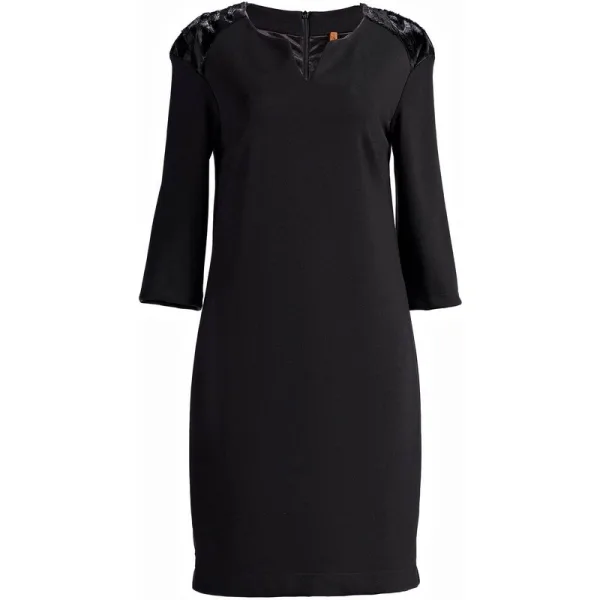 Jurk CONQUISTA met ¾ mouwen en een kleine V-opening bij de hals. Kunstbont op de schouders en verborgen ritssluiting op de rug. Recht silhouet en knielengte. Stretch polyester voering. Het model is 1.77m en draagt maat 36/S. 70%viscose-25%nylon-5%elastan+100%polyester