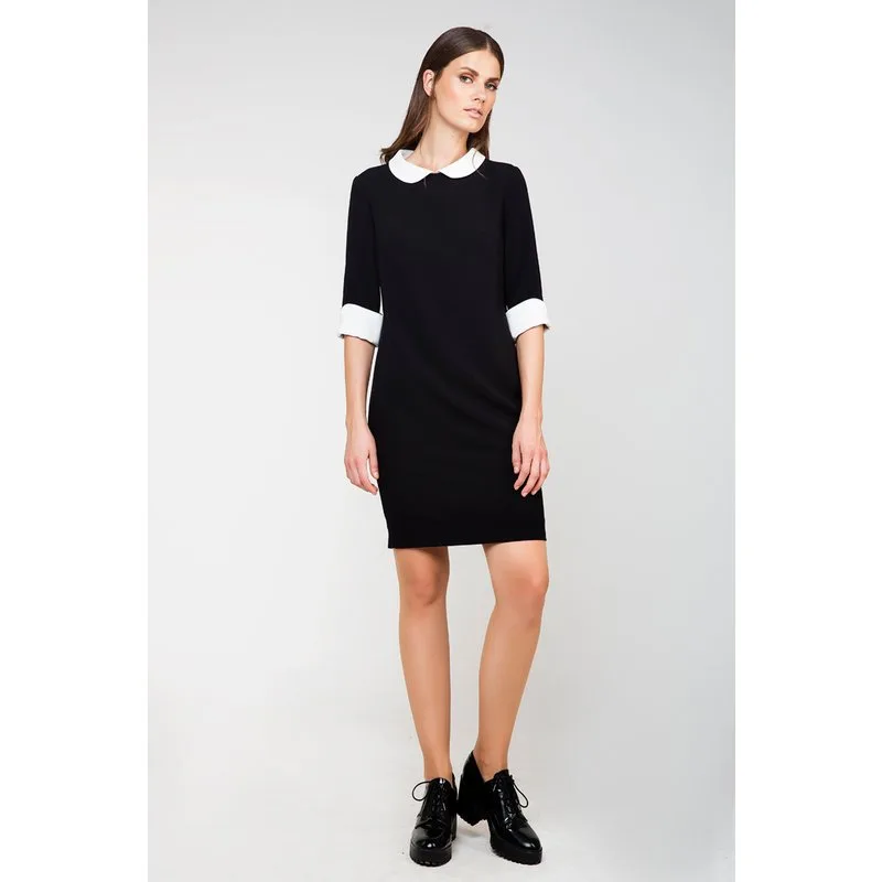 Winterjurk in geweven stijl crepe stof met een lichte stretch. Contrast afgeronde kraag. ¾ mouwen met contrast afgeronde manchetten. Verborgen rits aan de achterkant. Recht silhouet. Gevoerd. Lengte: 95 cm voor maat 36. Ons model is 178 cm lang en draagt maat 36.