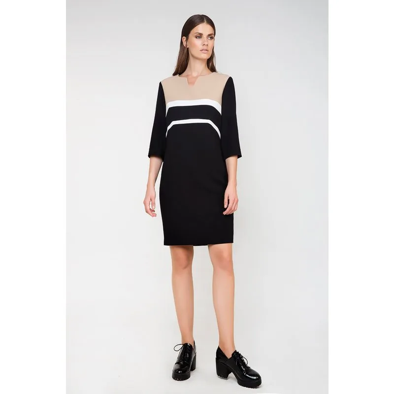 Winterjurk van geweven crêpe stof met een lichte stretch. Uitgevoerd in zwart met ecru panelen op de borst en beige daarboven. Kleine V-hals en mouwen in ¾ lengte. Recht silhouet. Gevoerd. Lengte: 95cm voor maat 36.Ons model is 178cm en draagt maat 36.