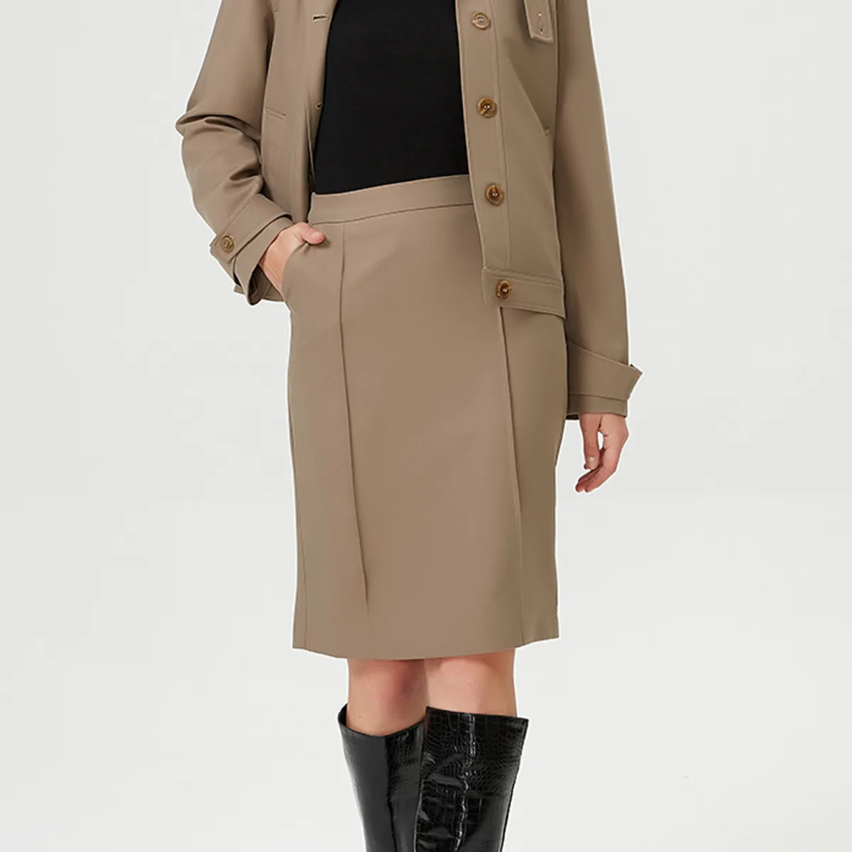 Een eenvoudige en verfijnde snit waarmee deze rok kan worden geassocieerd met veel stukken (shirt, trui, blouse, t-shirt en jas). Combineer goed met ons "Kort -gekleurde kraagjack". Discreet en structurering van details van kleine gestikte plooien aan de voorkant. Productdetails: • vorm: rechts • Lengte: 60 cm • Zipzijde • Zijzakken
