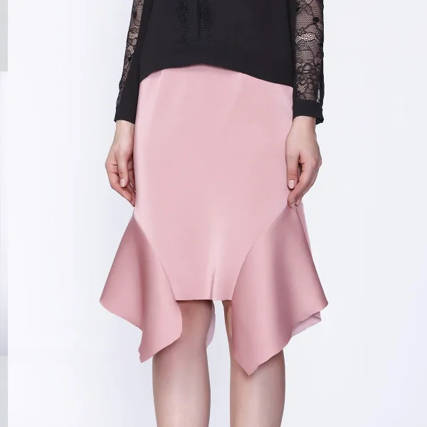 Dankzij zijn vloeiende satijnen stof biedt deze rok een zeer elegante lijn en een comfortabele slijtage. In de taille wordt het enigszins verbreedt van de heupen en vervolgens flares dankzij ruches. Kan worden gecombineerd met elke vorm van blouses, shirts, tops en is geschikt voor zowel dag als avond. Productdetails : Vorm: uitlooplopen - Tulp Lengte: 55 cm Onzichtbare rugzip