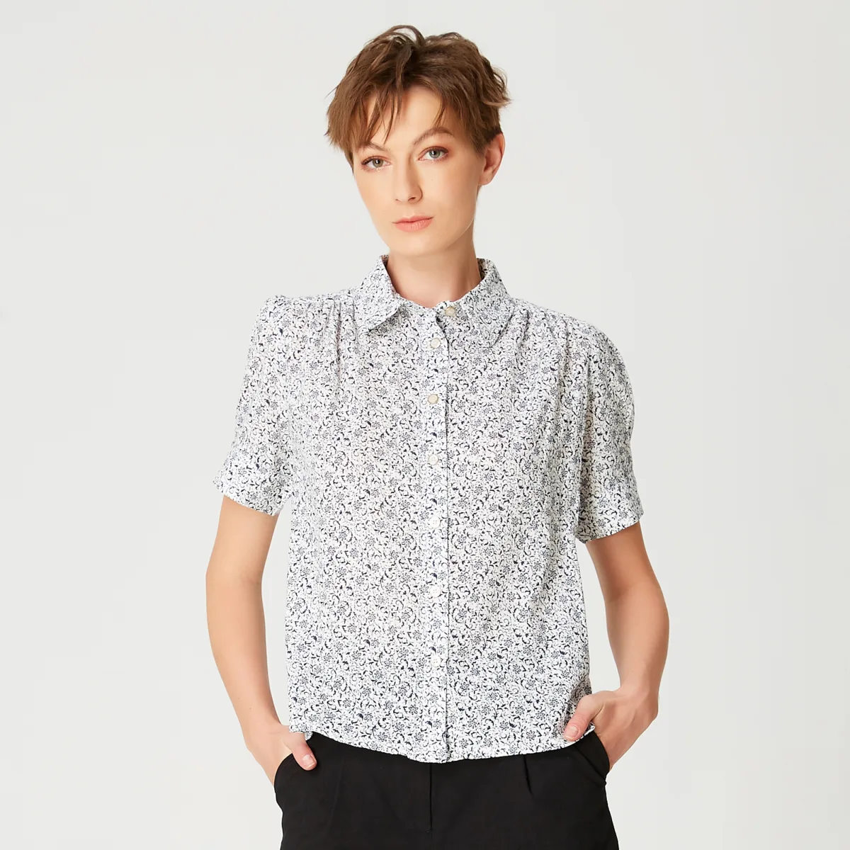 Een eenvoudige en comfortabele pasvorm, dit shirt is een veelzijdig stuk om te combineren met een rok en een blazer voor het kantoor of om over jeans te dragen. De monochrome print heeft een subtiel en verfijnd bloemmotief. Een essentieel in elke garderobe. Productdetails • Vorm: recht • Korte mouwen • Kraag • Midden voorgeknoopt • Lengte: 60 cm