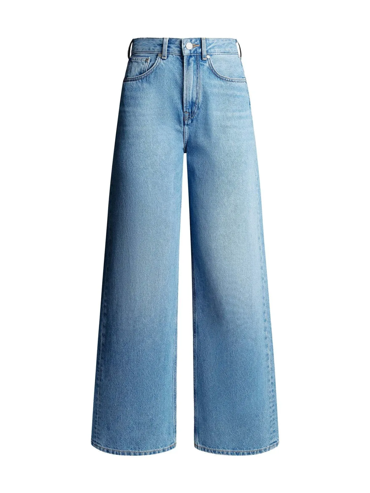 Design: Ritssluiting, 5-pocket-style, Knop sluiting; Materiaal: Katoen; Motief: Effen; Extra's: Contrasterende naden, Label patch/label flag, Riemlussen; Wassing: Blauw denim; Lengte: Lang/maxi; Pasvorm: Wide leg; Taillehoogte: Mid waist