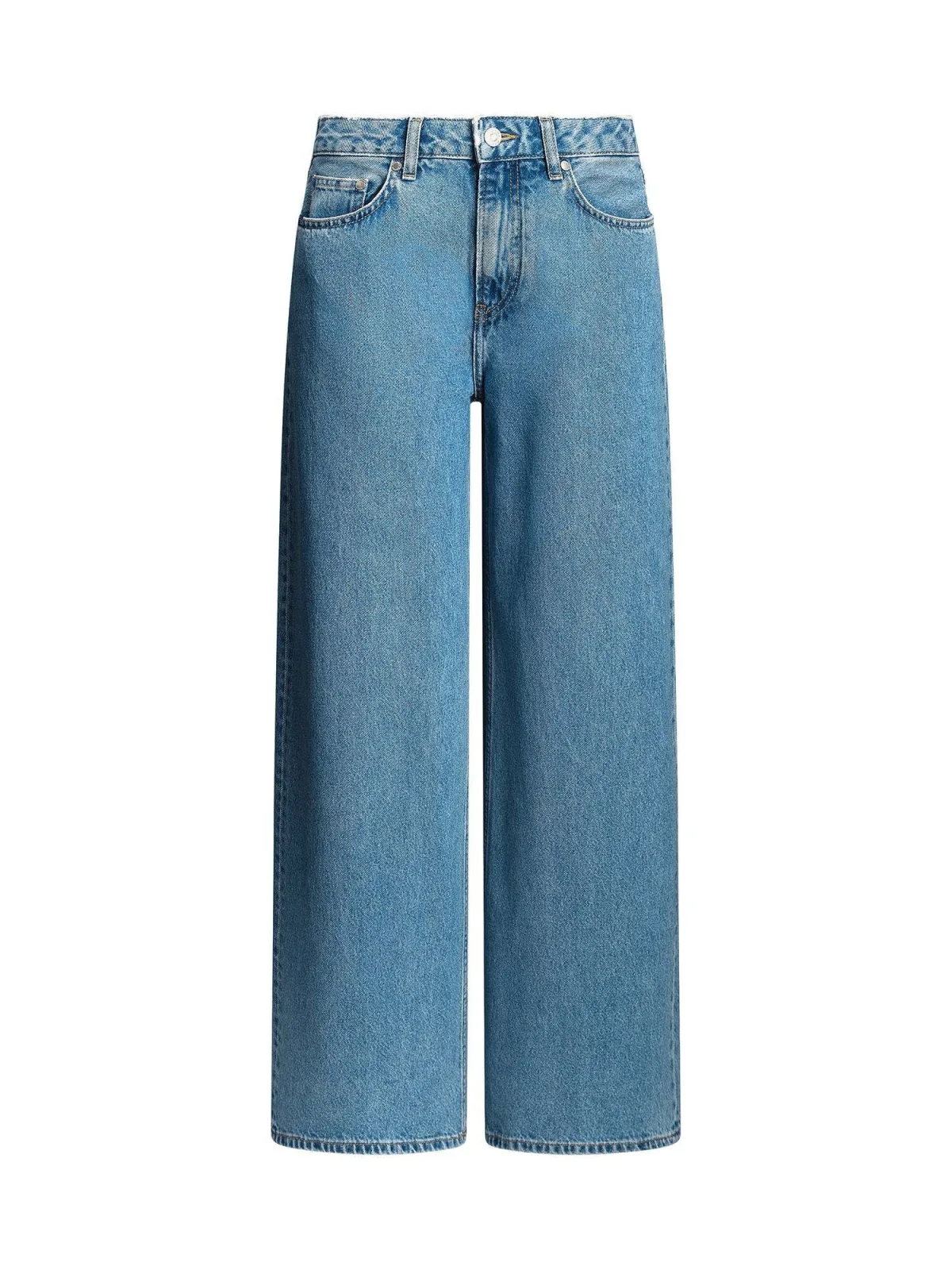 Design: Ritssluiting, 5-pocket-style, Knop sluiting; Type sluiting: Knoopsluiting; Materiaal: Katoen; Motief: Effen; Extra's: Contrasterende naden, Label patch/label flag, Stevige stof; Wassing: Blauw denim; Lengte: Lang/maxi; Pasvorm: Wide leg; Taillehoogte: Mid waist