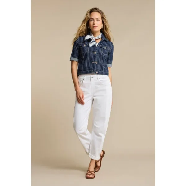 Stoer en stijlvol in één. Deze donkerblauwe denim jasje met fijne verticale strepen heeft een klassieke knoopsluiting, borstzakken en contrasterende stiksels voor een tijdloze look. De halflange mouwen met omslag en de licht getailleerde pasvorm zorgen voor een comfortabele en flatterende fit. Perfect als extra laagje in elk seizoen. Materiaal 72% katoen26%polyester 1%viscose 1%elastane Knoopsluiting aan de voorzijde Twee borstzakken met knoop Lengte: Middenachterlengte: 50 cm Code: SRB4835