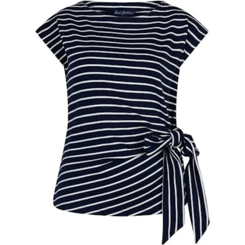 De Terry Stripe With Knot is een top met een strikdetail aan de voorkant. De top heeft een aangeknipte mouw, een ronde hals en horizontale strepen. Met de strik aan de voorkant kan de top getailleerd worden. Materiaal: 97%BCI katoen 3%elastane Code: SRB4759. XXL is hooguit maat 46.
