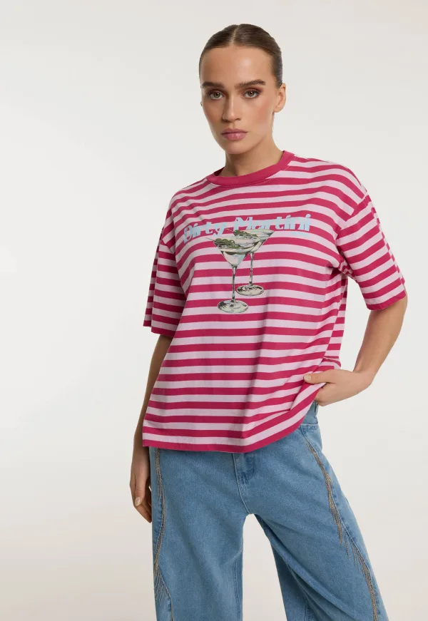 Dit is het R2603716981 Loui Striped T-shirt van het merk Refined Department. Dit T-shirt heeft een ronde hals en korte mouwen. Het is voorzien van een print op de borst, wat het een opvallend detail maakt.