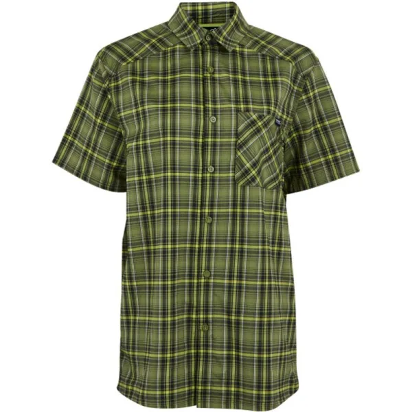 79% Polyester, 19% Viscose, 2% Elastaan. Stof: Rek, Geweven. Ontwerp: Geruite. Zakken: 1 borstzak. Sluiting: Knoopsluiting. Mouwtype: Korte mouwen. Halsuitsnijding: Omgeslagen kraag. Stoftechnologie: Vochtafvoerend, Sneldrogend, UV-bescherming. Zijwaartse ventilatieopeningen. 125gsm. S: 38 in. M: 40 in. L: 42 in. XL: 44 in. XXL: 48 in. 3XL: 51 in.