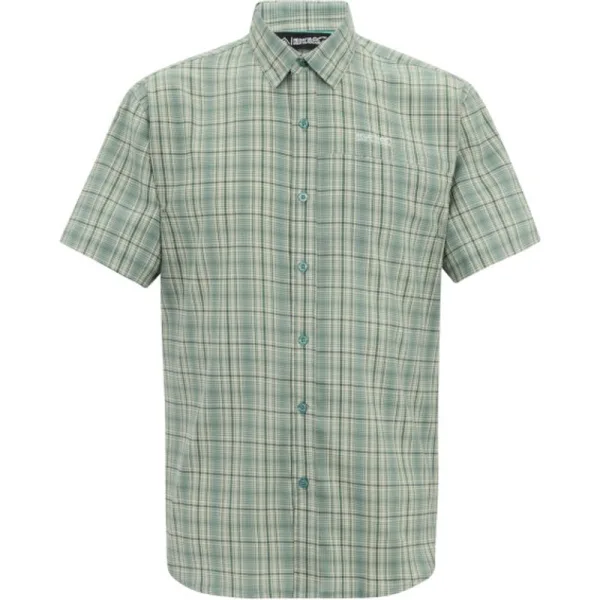 79% Polyester, 19% Viscose, 2% Elastaan. Stof: Rek, Geweven. Ontwerp: Geruite, Logo. Zakken: 1 borstzak. Mouwtype: Korte mouwen. Halsuitsnijding: Omgeslagen kraag. Stoftechnologie: Lichtgewicht, Vochtafvoerend, Sneldrogend. Splitjes opzij. 125gsm. S: 38 in. M: 40 in. L: 42 in. XL: 44 in. XXL: 48 in. 3XL: 51 in.