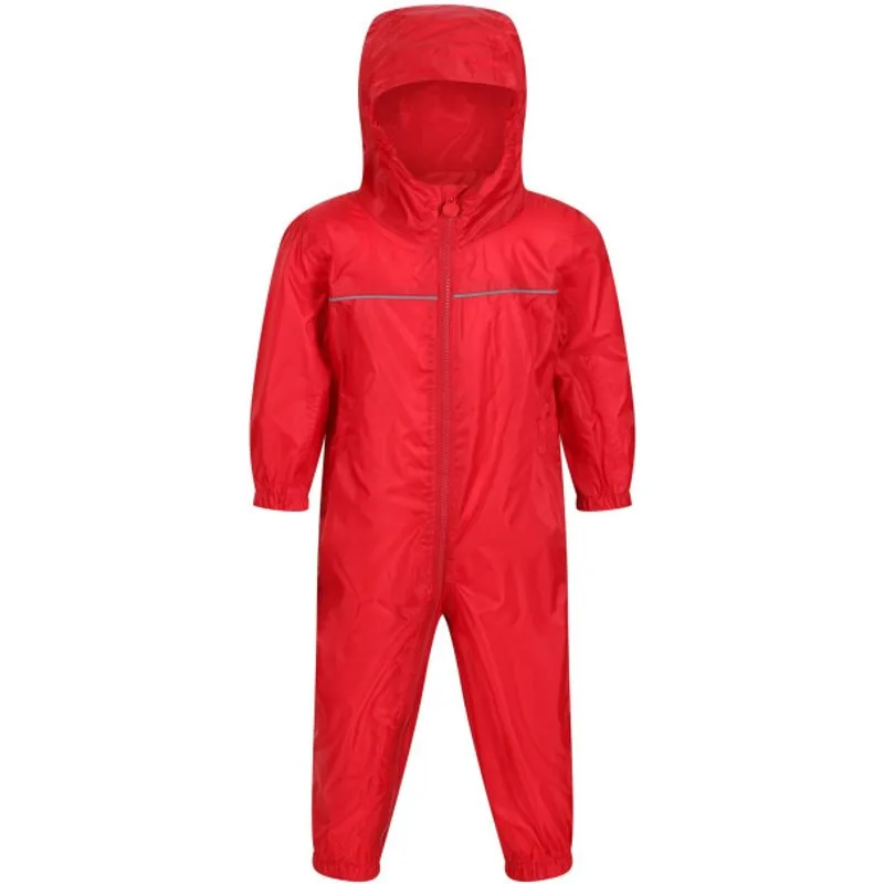 Baby/Kinder regenpak Waterdicht Ademende Winddicht Getapete naden Intergrale capuchon Reflecterende rand aan voor- en achterkant Gedeeltelijk elastische taille Elastische manchetten en zoom Lichtgewicht Stof: 100% polyester Formaat Regatta Little Adventurers (lengte ongeveer): 6-12 maanden (74-80cm), 12-18 maanden (80-86cm), 18-24 maanden (86-92cm), 24-36 maanden (92-98cm), 36 -48 maanden (98-104cm), 48-60 maanden (104-110cm), 60-72 maanden (110-116cm).