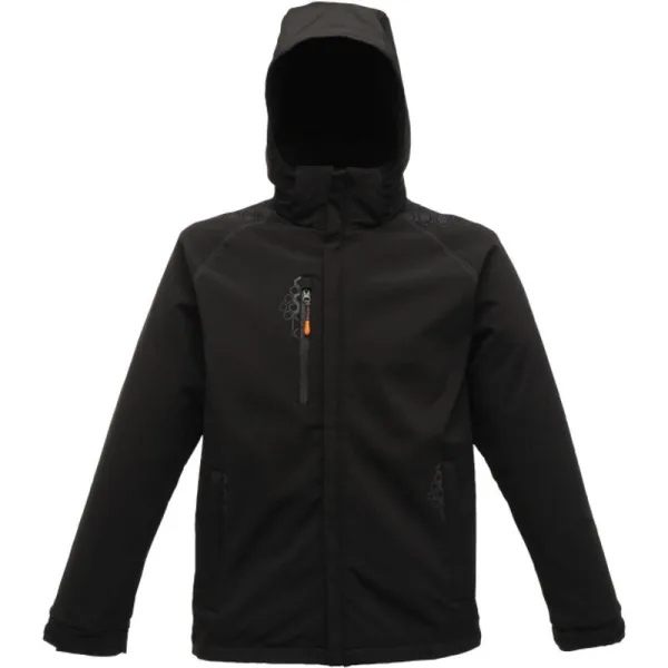 Softshell stof met warme rug Duurzame waterafstotende afwerking Met gaas gevoerd lichaam 2 onderste zakken met rits en waterdichte borstzak Afneembare capuchon met versteller Gelede mouwontwerp Verstelbare manchetten Verstelbare schokkoord zoom Verborgen ritssluiting in voering voor toegang tot borduurwerk Gewicht: 500 g / m Stof: zie eigenschappen 96% polyester / 4% elastaan.
