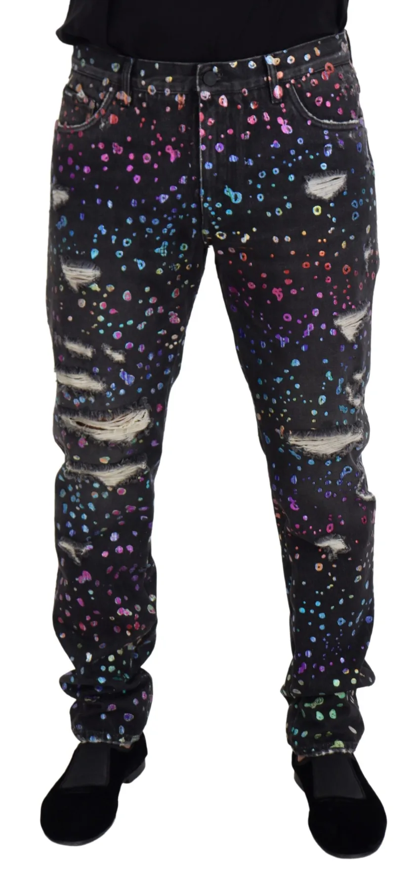 Stap naar buiten, val op, maak een statement. Deze Dolce & Gabbana jeans bieden premium comfort met een onmiskenbare stijl. De rechte pasvorm biedt een veelzijdige silhouet. De donkere wassing is versterkt met een opvallende iriserende regenboog stippenprint. Versleten details en rafelige randen creëren een stoere, moderne uitstraling. Geniet van duurzame, onderhoudsarme constructie. Perfect voor casual streetwear of geklede gelegenheden, deze jeans integreren moeiteloos in jouw lifestyle en voegen een vleugje gedurfde individualiteit toe aan elke outfit.