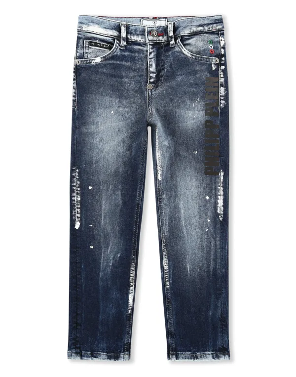 Stone washed denim 5 pocket pants can still be defined as a classic even though they have a contemporary look like this stretch version with special rips and mendings. The brand's lettering is printed on the left leg. Single metal button at waist. Metal badge over the right rear pocket. Turn-up bottom. Fit: Regular.