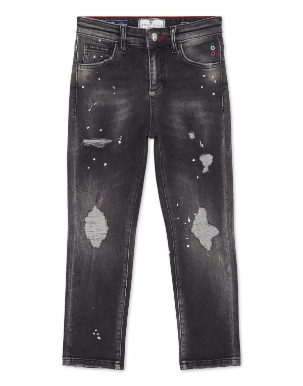 Here's how to be cool with these five-pocket denim pants featuring distinctive details. Stone washed denim with wear-and-tear and rips Single metal button PP Hexagon on a leather badge sewn on the right rear pocket Fit: Super Straight
