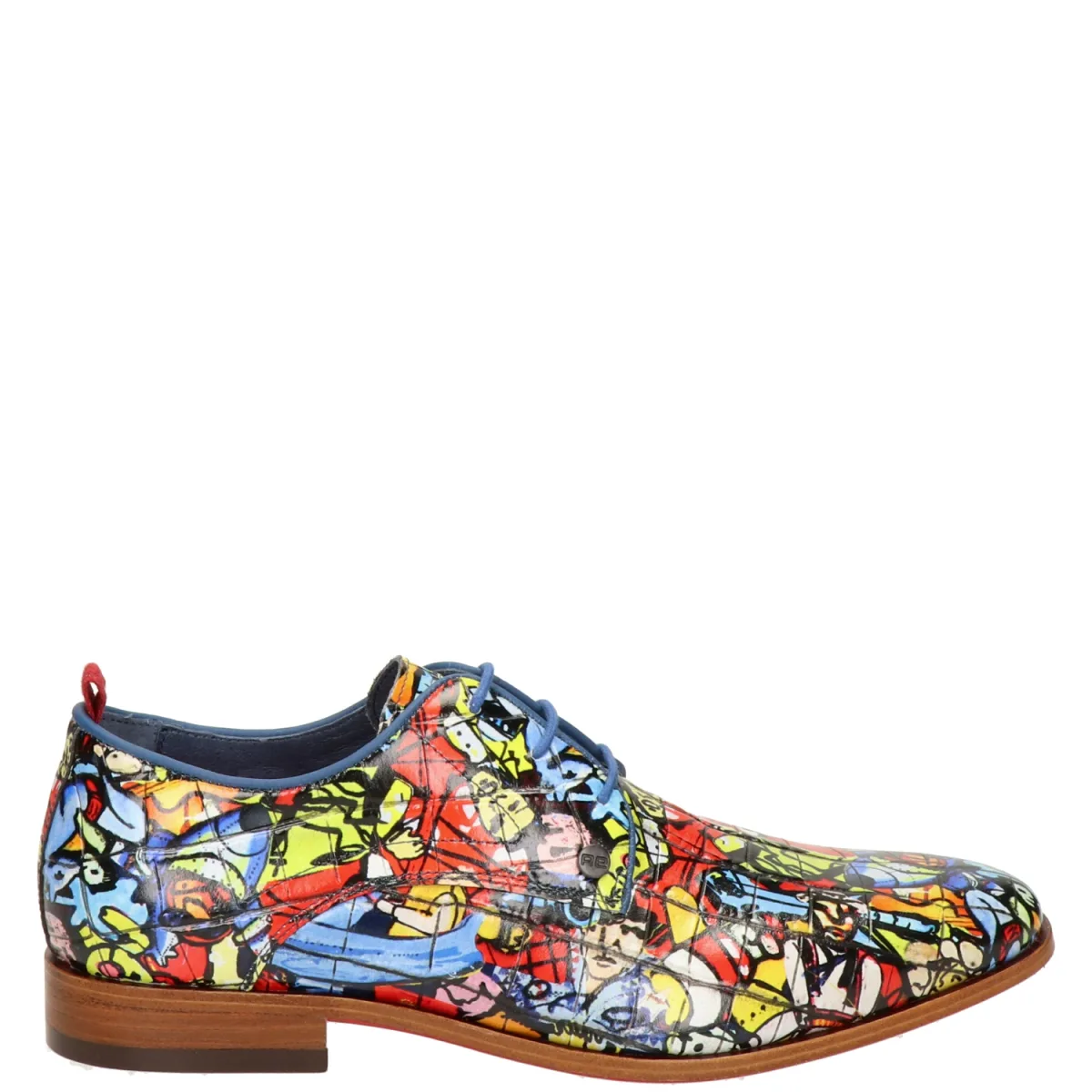 Rehab Fred Brood heren veterschoen Een kunstwerk aan je voeten met deze herenschoen uitgevoerd met een Herman Brood print! Ook tof om te dragen naar nette gelegenheden zoals een bruiloft. Uitgevoerd in leer wat op duurzame wijze geproduceerd is zonder chemicaliën. Gevoerd met leer wat met ademend vermogen bevorderend is voor een gezond voetklimaat. Voorzien van een leren voetbed wat bovendien antibacterieel is en een goede vocht- en warmteregulatie biedt. Zo blijven de voeten en schoenen langer fris. Afgewerkt met een opvallende rubberen loopzool.