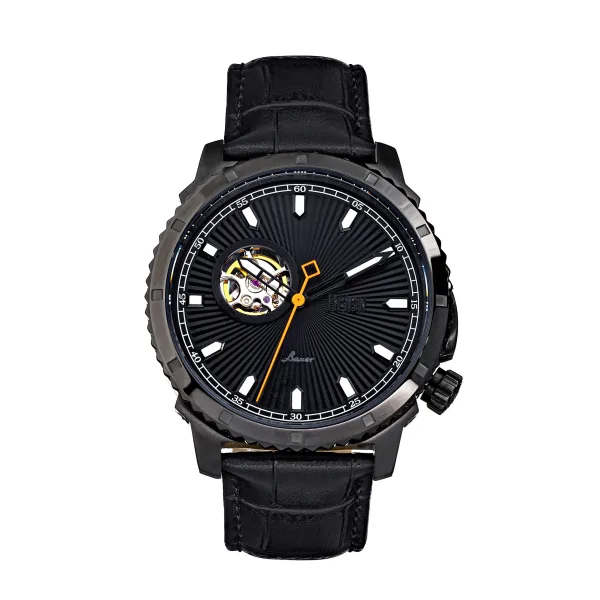 316L roestvrijstalen behuizing van chirurgische kwaliteit; Seiko NH38 automatisch uurwerk met juwelen; Juweellagers: 24 juwelen; 36 uur gangreserve; Slagen per uur (BPH): 21600/uur; Saffiergecoat mineraal kristal; Semi-skelet wijzerplaat; Observatie Caseback om beweging te bekijken; Logo-gegraveerde kroon; Ontwerp kroonbeschermer; Lederen band met krokodil reliëf; Lichtgevende wijzers; Lichtgevende markeringen; 44 mm kastdiameter; 5ATM waterbestendigheid;